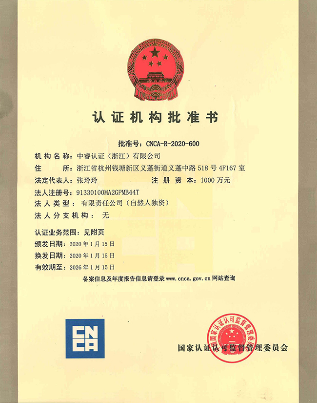 Zhongrui certification (Zhejiang) Co., Ltd. has been officially approved by China National Certification and accreditation supervision and Administration Commission with approval number of CNCZ-R-2020-600. It has officially become a certification body that can be engaged in ISO9001, ISO14001 and iso45001. The company is committed to providing value-added audit services for enterprises.