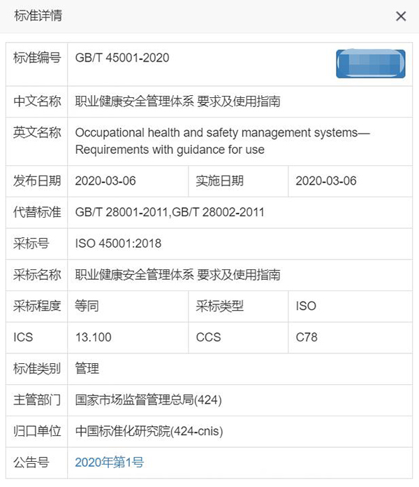 2020年3月6日,國(guó)家市場(chǎng)監(jiān)管總局 國(guó)家標(biāo)準(zhǔn)化管理委員會(huì)(SAC)發(fā)布2020年第1號(hào)公告,批準(zhǔn)GB/T45001-2020《職業(yè)健康安全管理體系要求及使用指南》,該標(biāo)準(zhǔn)是等同采用ISO 45001:2018《Occupational health and safety management systems—Requirements with guidance for use》代替了GB/T 28001-2011、GB/T 28002-2011。