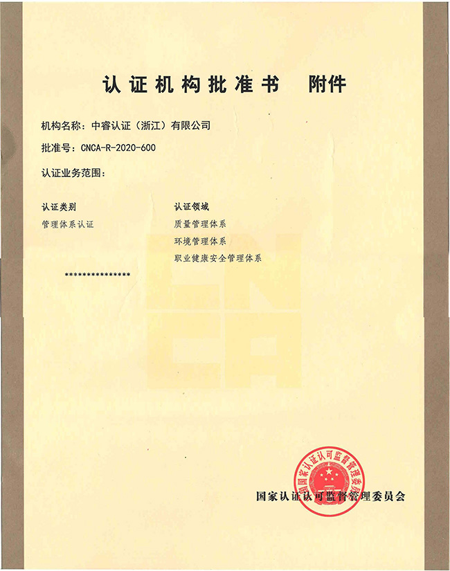 中睿認證(浙江)有限公司正式獲得中國國家認證認可監(jiān)督管理委員會批準,批準號:CNCA-R-2020-600,正式成為可以從事ISO9001,ISO14001,ISO45001的認證機構,公司致力于為企業(yè)提供增值審核服務。